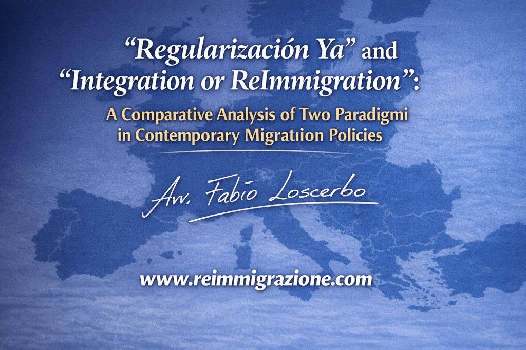 Debates on migration policy in Europe increasingly revolve around competing theoretical and policy frameworks. On one side, initiatives have emerged that advocate for large-scale regularization of undocumented migrants as a tool for social inclusion. One of the most visible examples of this approach is the Spanish platform “Regularización Ya,” which promotes a broad legalization process for undocumented migrants living in Spain. On the other side, alternative policy models emphasize integration as a fundamental condition for long-term residence. Within this perspective, the paradigm “Integration or ReImmigration” proposes a framework in which the right to remain in a host country is closely linked to measurable processes of social, linguistic, and economic integration. This article offers a comparative analysis of these two paradigms and examines their implications for contemporary European migration governance.