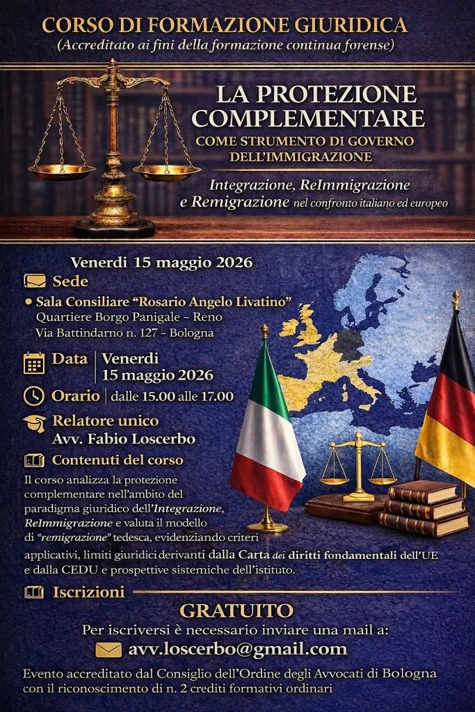 Nel quadro della riflessione giuridica sviluppata attorno al paradigma “Integrazione o ReImmigrazione”, l’Avv. Fabio Loscerbo organizza a Bologna una serie di corsi formativi dedicati alla protezione complementare nel diritto dell’immigrazione, accreditati dal Consiglio dell’Ordine degli Avvocati di Bologna ai fini della formazione continua forense.