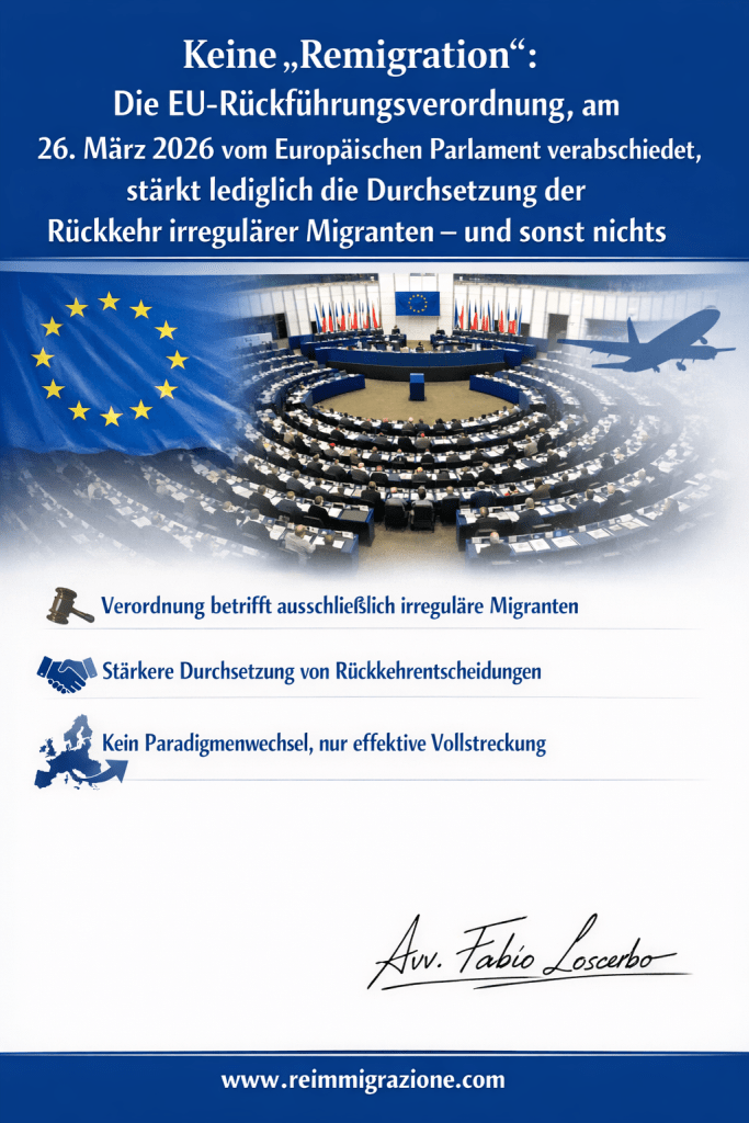 Am 26. März 2026 hat das Europäische Parlament eine neue Verordnung über die Rückführung von Drittstaatsangehörigen ohne Aufenthaltsrecht beschlossen. In Teilen der öffentlichen Debatte – insbesondere in Deutschland, wo der Begriff der „Remigration“ eine starke politische und ideologische Konnotation angenommen hat – wurde diese Maßnahme vorschnell als ein Schritt in Richtung einer solchen Politik interpretiert. Eine solche Lesart hält einer juristischen Analyse jedoch nicht stand.