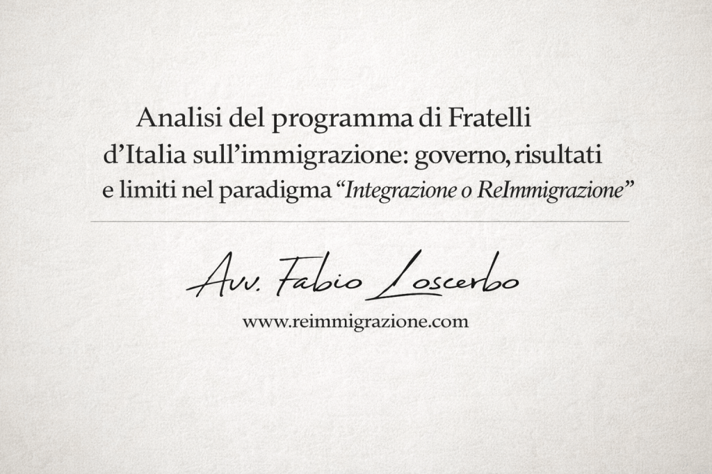 In conclusione, il programma di Fratelli d’Italia rappresenta, allo stato, il tentativo più avanzato di ricondurre l’immigrazione entro una logica di sovranità e controllo. Tuttavia, per evolvere in un modello giuridico completo, deve ancora compiere un passaggio decisivo: trasformare l’integrazione da obiettivo politico a criterio normativo vincolante e collegare in modo esplicito il mancato inserimento alla reimmigrazione. Solo così il paradigma potrà dirsi realmente compiuto.