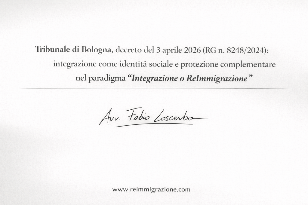- Tribunale di Bologna, decreto del 3 aprile 2026 (RG n. 8248/2024): integrazione come identità sociale e protezione complementare nel paradigma “Integrazione o ReImmigrazione”
