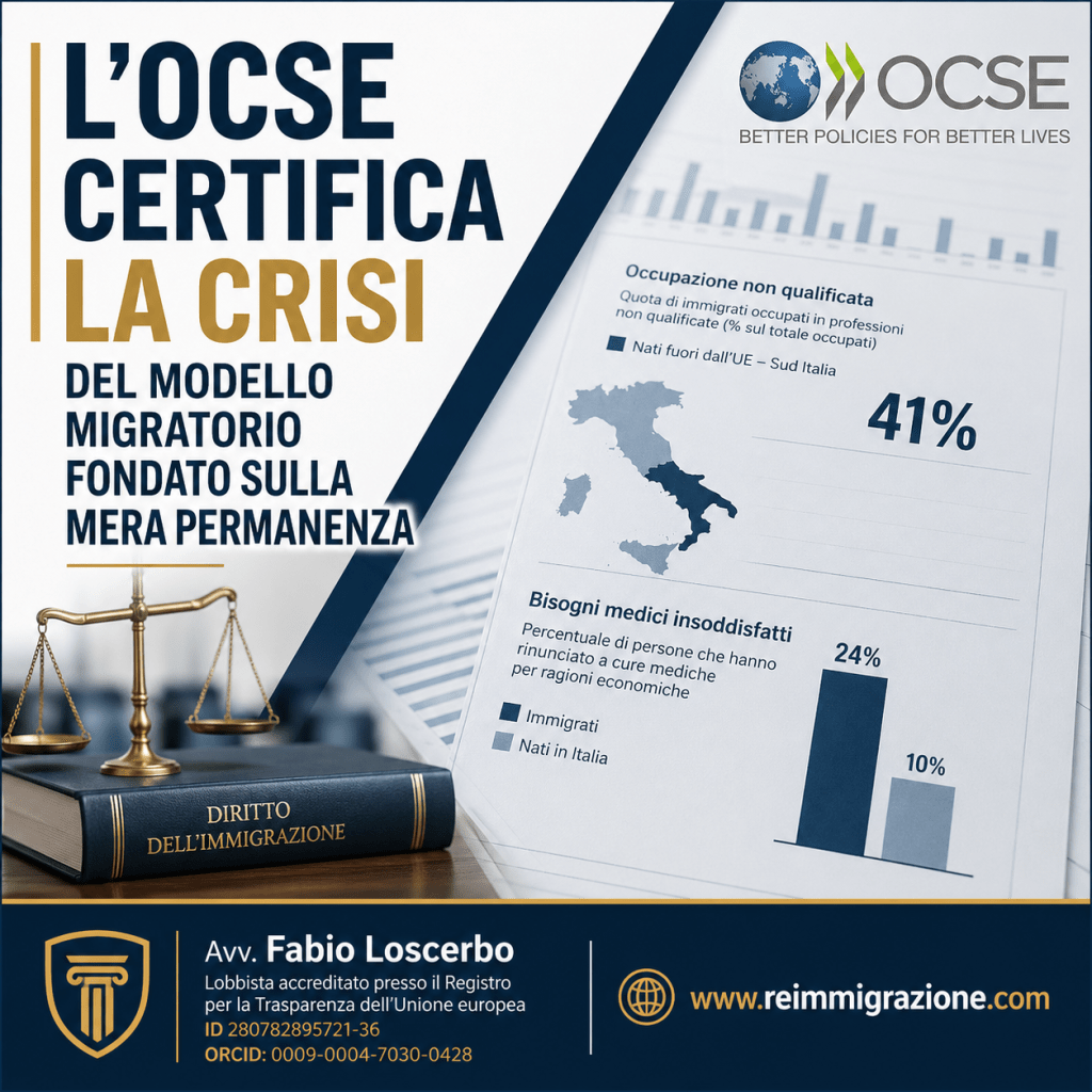 Il rapporto 2025 dell’Organisation for Economic Co-operation and Development sull’integrazione dei migranti in Italia offre elementi empirici che meritano una lettura non meramente sociologica, ma propriamente ordinamentale. I dati relativi alla concentrazione della popolazione straniera in segmenti occupazionali scarsamente qualificati, nonché quelli concernenti il divario nell’accesso effettivo a prestazioni sanitarie essenziali, consentono infatti di mettere in discussione un presupposto implicito che attraversa larga parte del diritto dell’immigrazione contemporaneo: l’equazione tra durata della permanenza e integrazione.